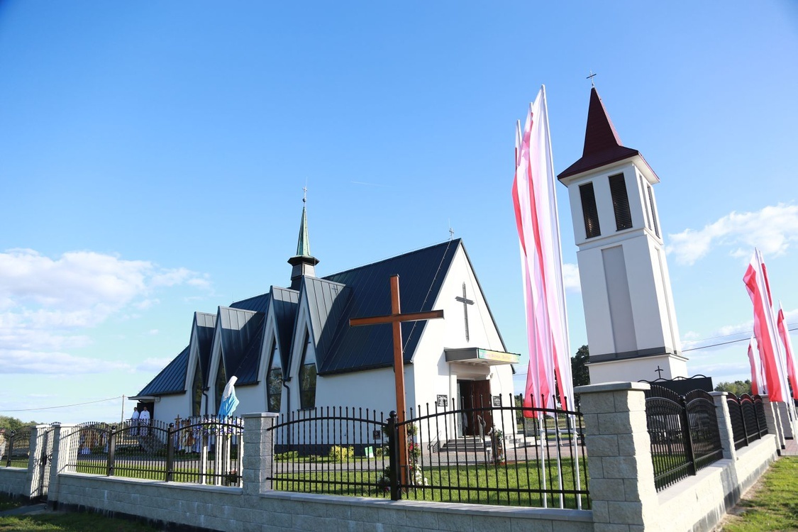 Kościół pw. Podwyższenia Krzyża został wybudowany w 1969 r. Prace trwały od 14 VI 1969 r. do 6 XII 1969 r. wg planów Jana Marca i Władysława Uchmana. Poświęcenia i wmurowania kamienia węgielnego dokonał 29 VI 1969 r. bp Jerzy Ablewicz, który przwodniczył obrzędowi poświęcenia kościoła 7 XII 1969 r. Stacje drogi krzyżowej wykonał Adam Florek. Witraże zaprojektował Jan Stańdo. W roku 1984 w otoczeniu kościoła wybudowano wolnostojącą wieżę wg projektu Jana Marca.